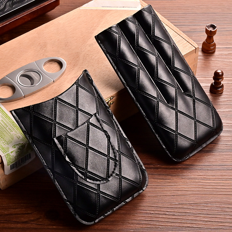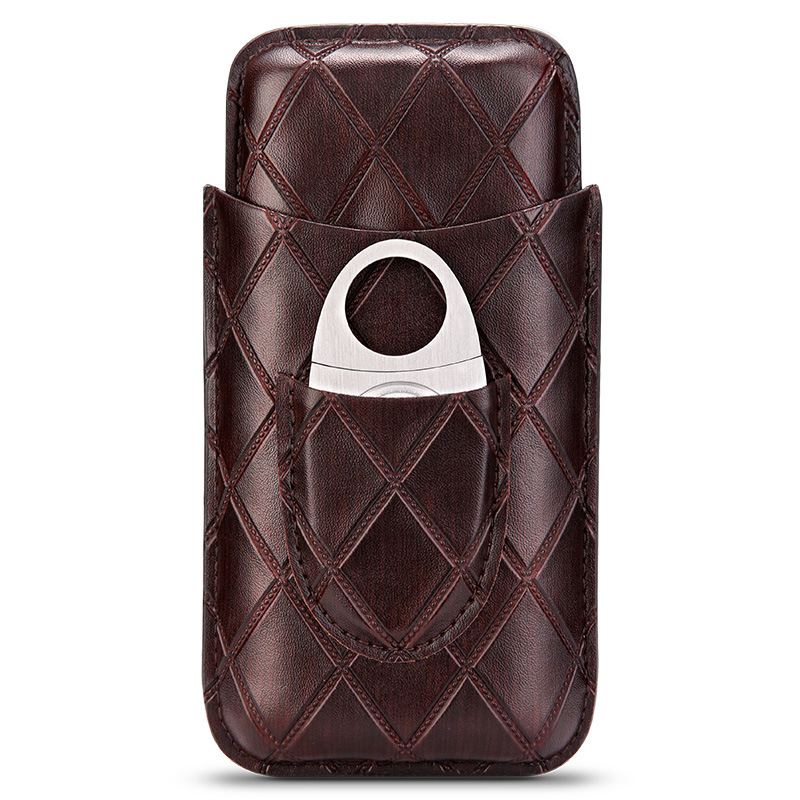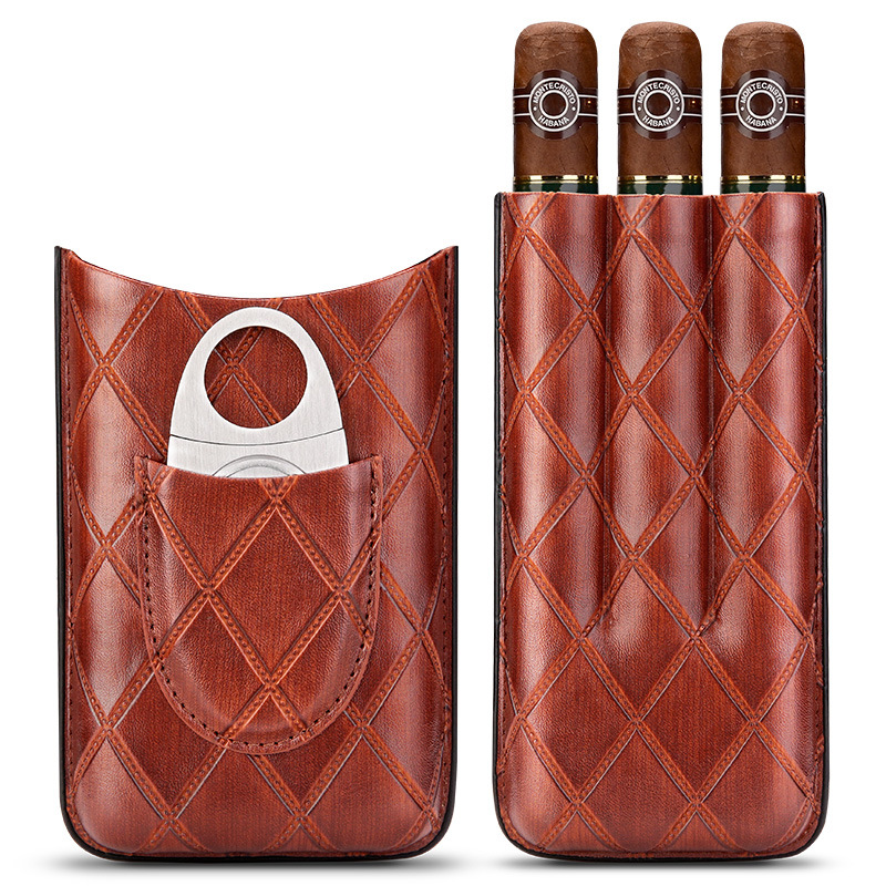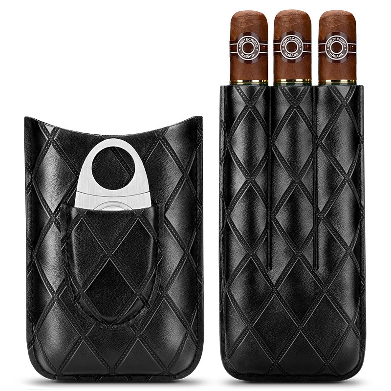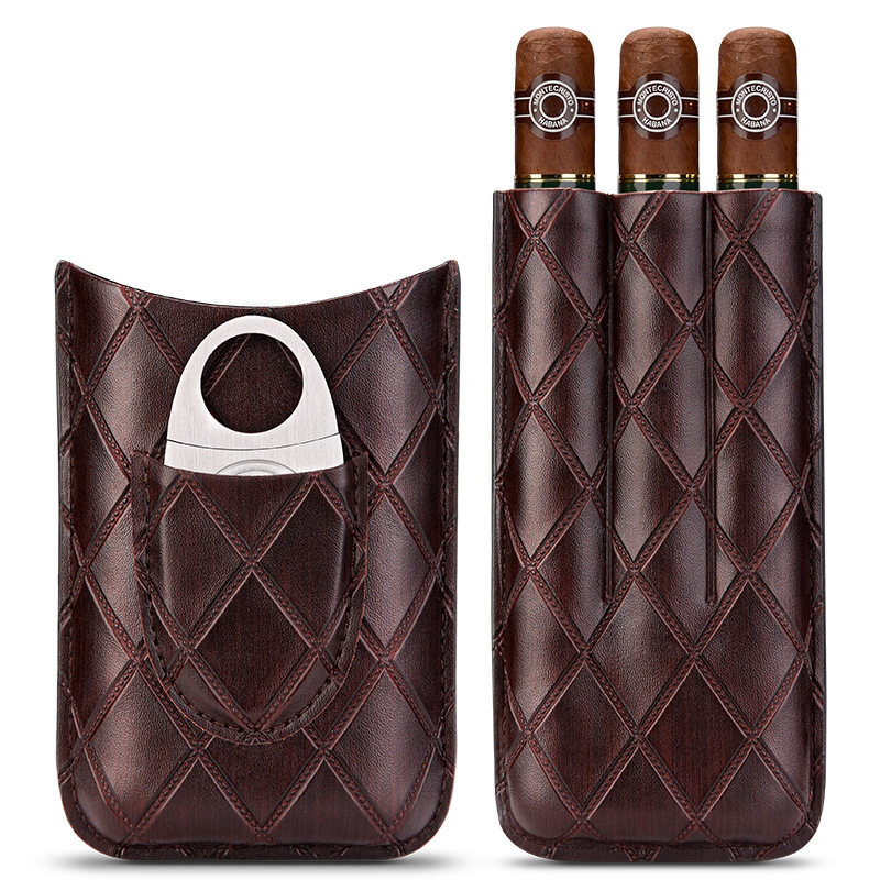 Portable Leather Cigar Case For 3 Cigars With Cigar Cutter