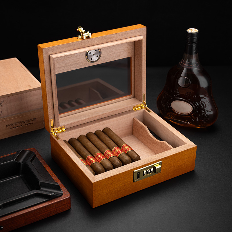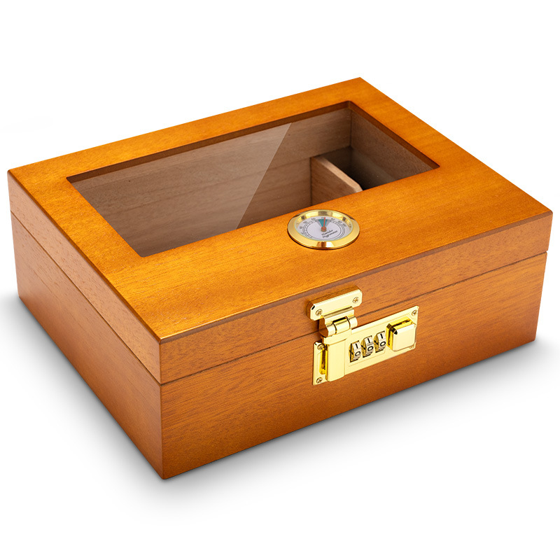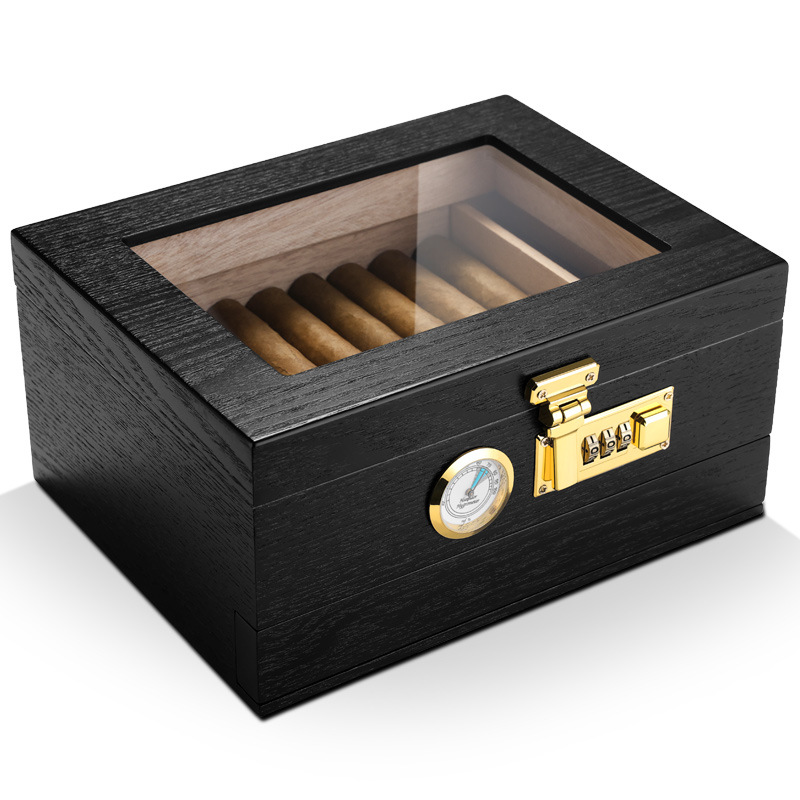 1. Introducing our exquisite Cigar Humidor Case, a perfect blend of elegance and functionality designed for the discerning cigar aficionado. This beautifully crafted cigar box features a stunning glass lid that not only showcases the rich, textured beauty of the cigar within but also allows for easy visibility and access. The humidor is meticulously constructed to maintain optimal humidity levels, ensuring that your cigars remain fresh and flavorful. The sleek design and premium materials make it an ideal addition to any collection, whether displayed on a coffee table or stored in a dedicated cigar room.