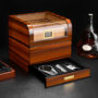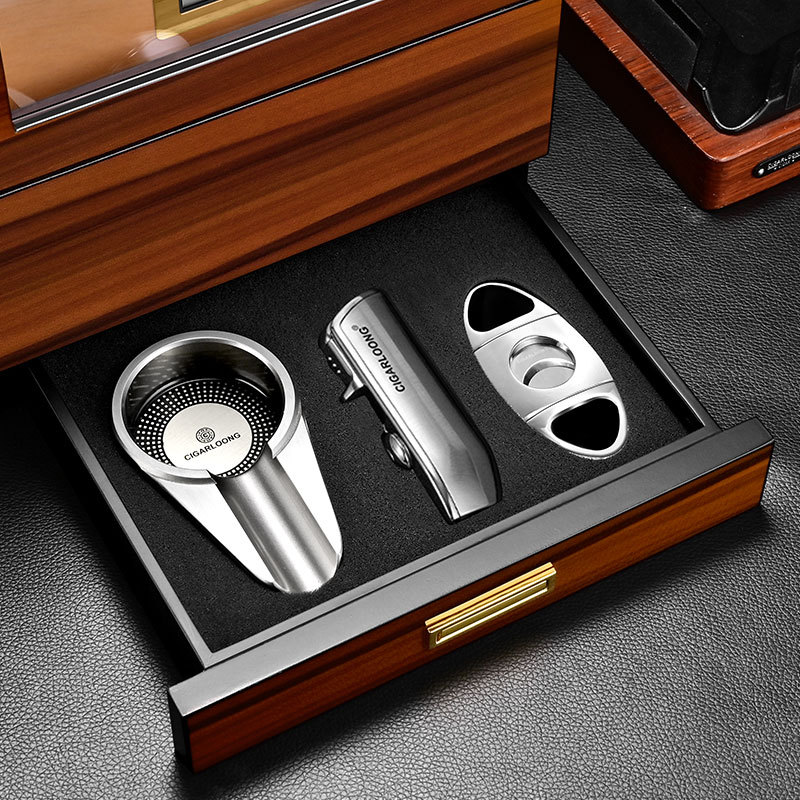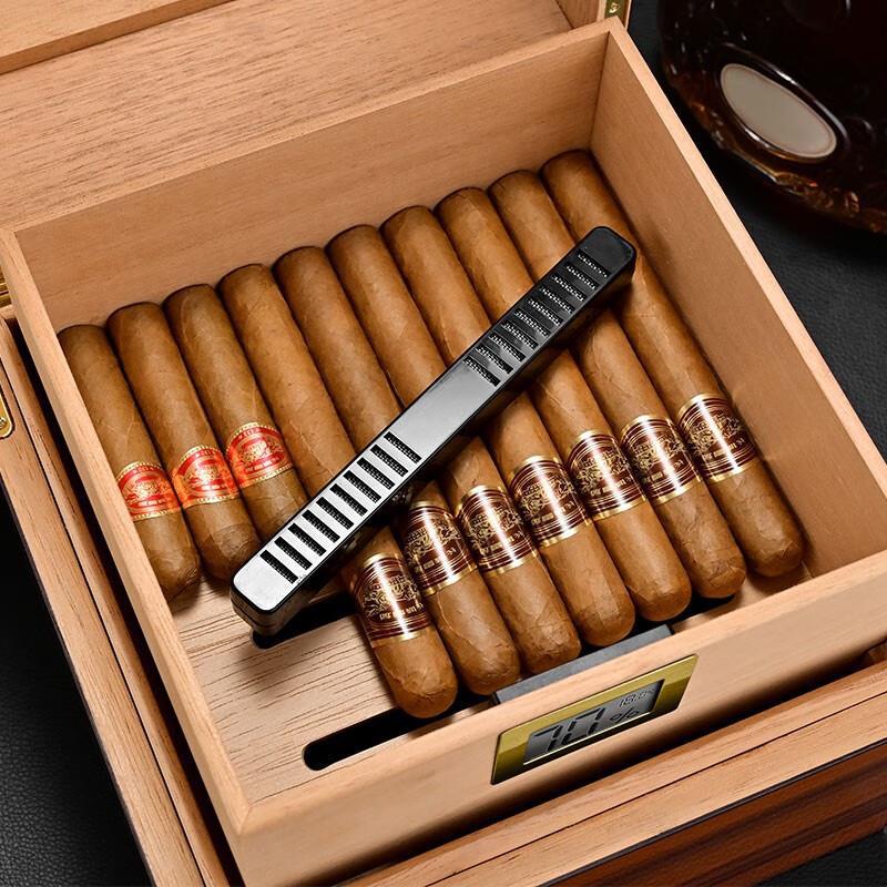 1. Introducing our exquisite Cigar Humidor Case, a perfect blend of elegance and functionality designed for the discerning cigar aficionado. This beautifully crafted cigar box features a stunning glass lid that not only showcases the rich, textured beauty of the cigar within but also allows for easy visibility and access. The humidor is meticulously constructed to maintain optimal humidity levels, ensuring that your cigars remain fresh and flavorful. The sleek design and premium materials make it an ideal addition to any collection, whether displayed on a coffee table or stored in a dedicated cigar room.