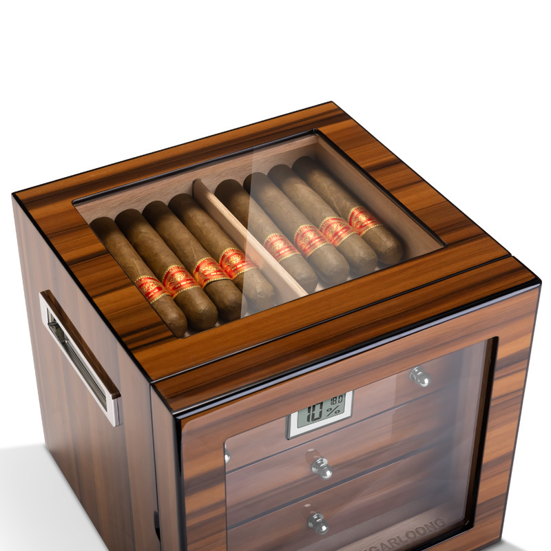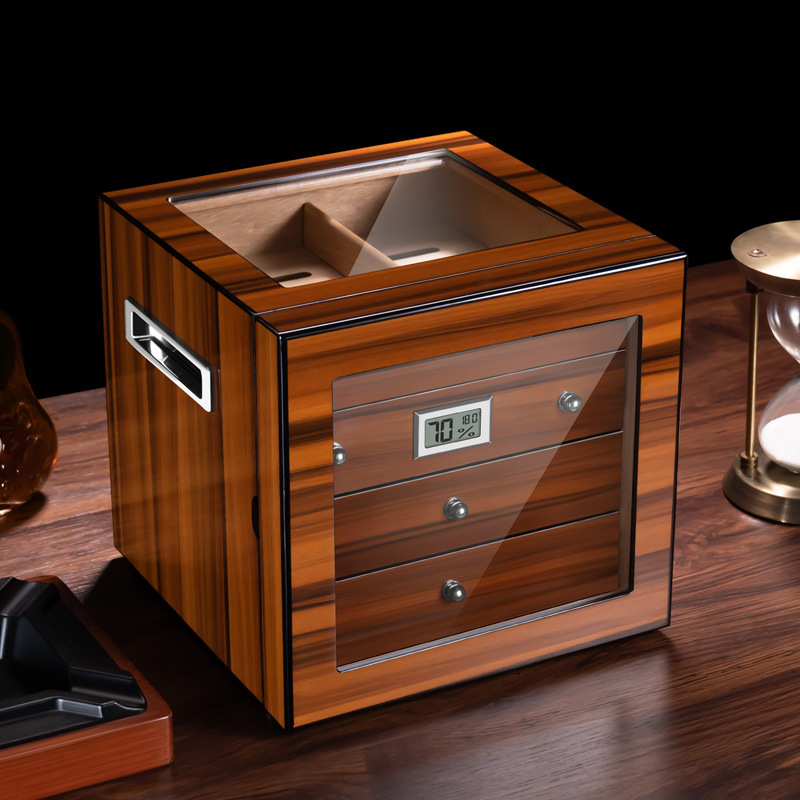 1. Introducing our exquisite Cigar Humidor Case, a perfect blend of elegance and functionality designed for the discerning cigar aficionado. This beautifully crafted cigar box features a stunning glass lid that not only showcases the rich, textured beauty of the cigar within but also allows for easy visibility and access. The humidor is meticulously constructed to maintain optimal humidity levels, ensuring that your cigars remain fresh and flavorful. The sleek design and premium materials make it an ideal addition to any collection, whether displayed on a coffee table or stored in a dedicated cigar room.