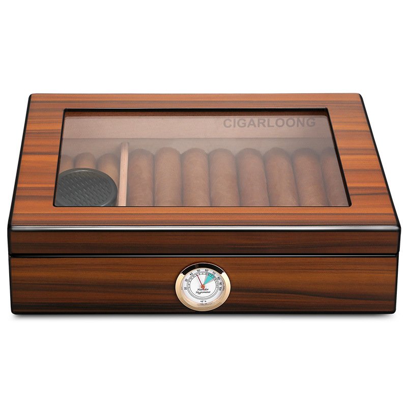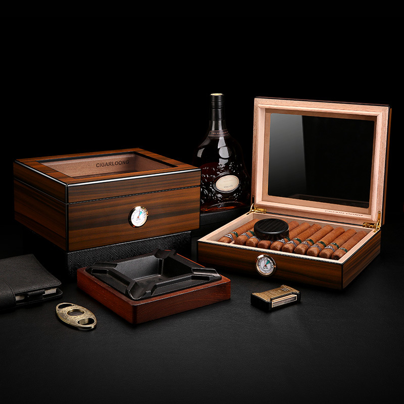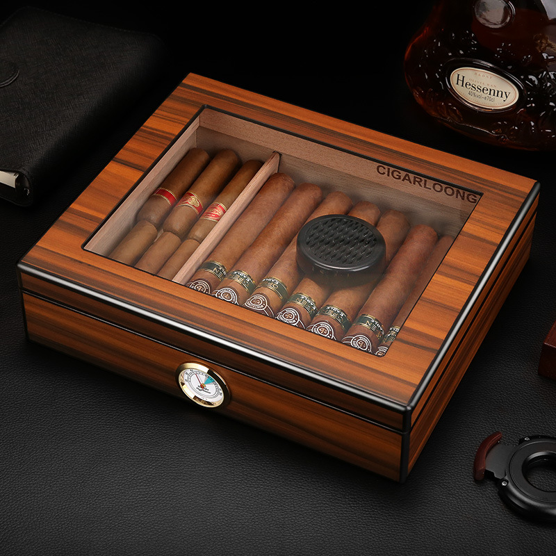 1. Introducing our exquisite Cigar Humidor Case, a perfect blend of elegance and functionality designed for the discerning cigar aficionado. This beautifully crafted cigar box features a stunning glass lid that not only showcases the rich, textured beauty of the cigar within but also allows for easy visibility and access. The humidor is meticulously constructed to maintain optimal humidity levels, ensuring that your cigars remain fresh and flavorful. The sleek design and premium materials make it an ideal addition to any collection, whether displayed on a coffee table or stored in a dedicated cigar room.