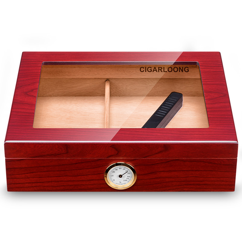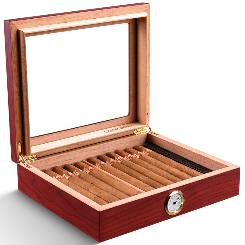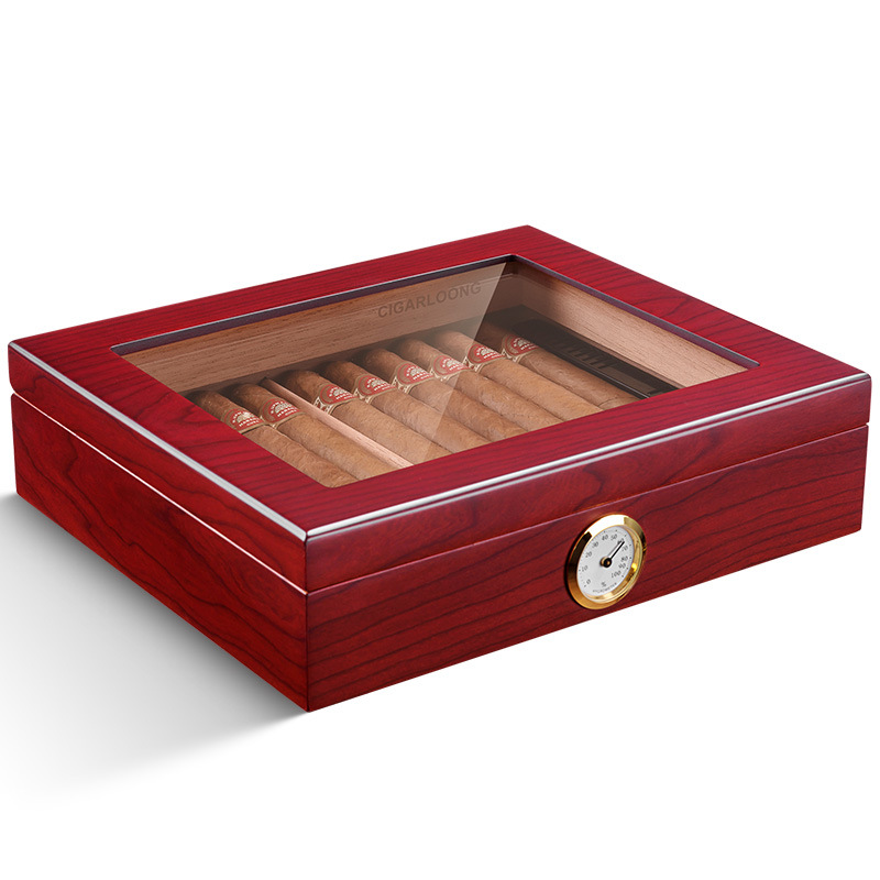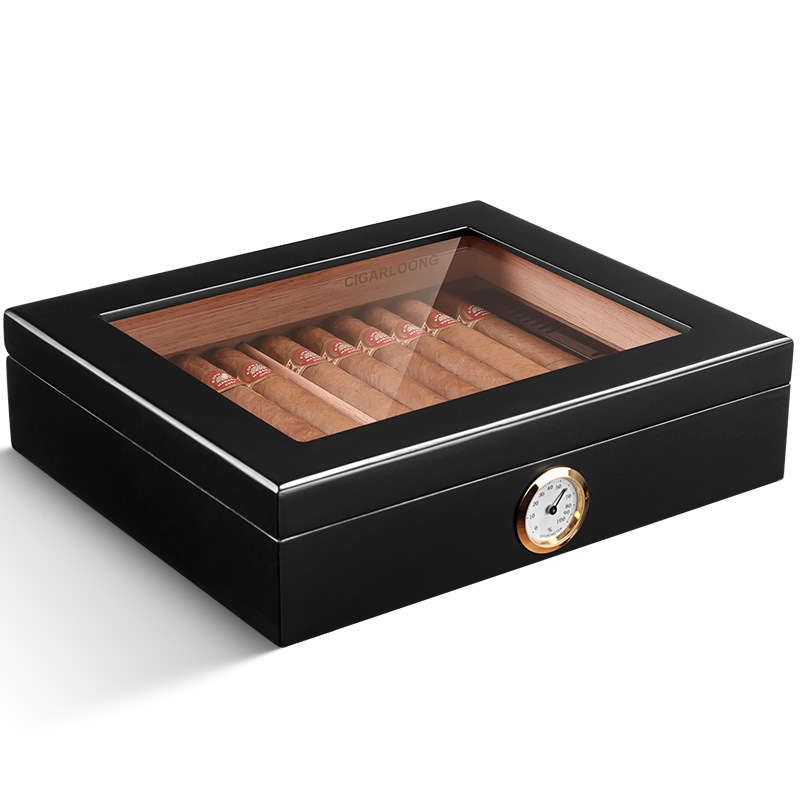 1. Introducing our exquisite Cigar Humidor Case, a perfect blend of elegance and functionality designed for the discerning cigar aficionado. This beautifully crafted cigar box features a stunning glass lid that not only showcases the rich, textured beauty of the cigar within but also allows for easy visibility and access. The humidor is meticulously constructed to maintain optimal humidity levels, ensuring that your cigars remain fresh and flavorful. The sleek design and premium materials make it an ideal addition to any collection, whether displayed on a coffee table or stored in a dedicated cigar room.